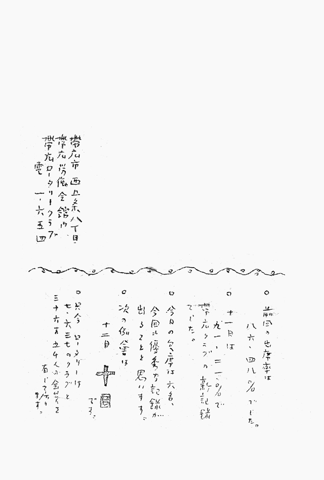 HOME >RC 今昔物語 > 昭和27年11月26日 RC会報 admin 昭和27年11月26日 RC会報 2008.07.09 帯広ロータリークラブの昭和27年11月26日の会報、裏面です。 帯広ロータリークラブの昭和27年11月26日の会報、表面です。
