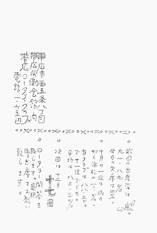 HOME >RC 今昔物語 > 昭和27年12月3日 RC会報 admin 昭和27年12月3日 RC会報 2008.07.09 帯広ロータリークラブの昭和27年12月3日の会報、表面です。 帯広ロータリークラブの昭和27年12月3日の会報、裏面です。