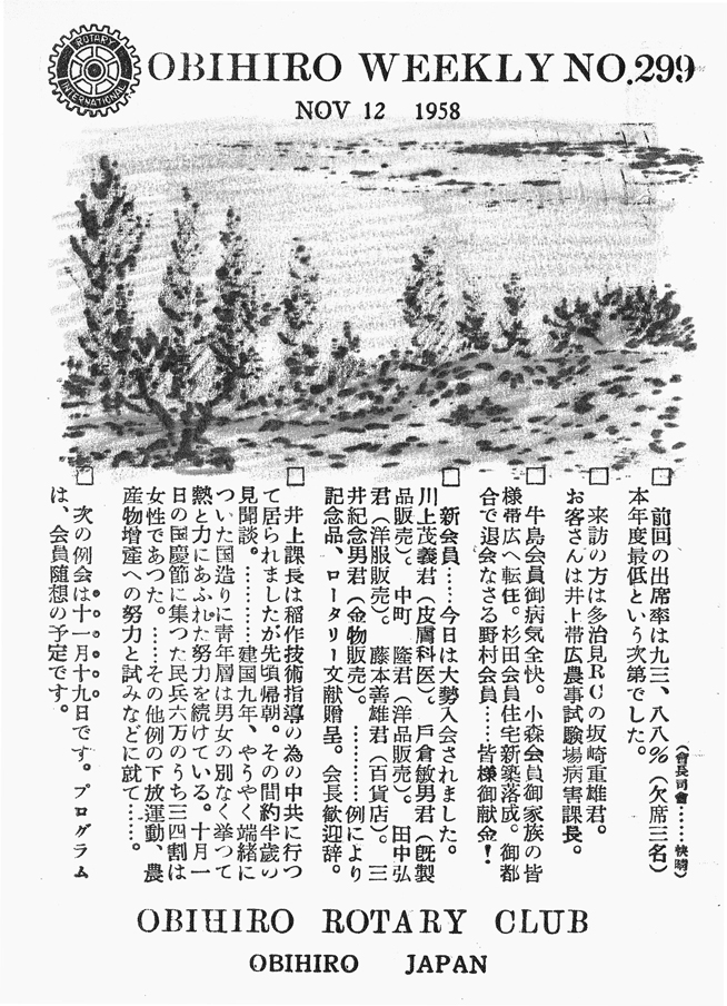 平成20年5月7日 第3112回帯広ロータリークラブの例会「会員卓話」にて、クラブ会報「今昔物語」と題してパストガバナー田中 弘会員より下記の会報に関する提案があり、今期(2008-09)より帯広ロータリークラブの会報初期(ハガキ)をクラブ会報とクラブホームページに掲載し先人の苦労と当時のクラブの運営について学んで行きます。 ※同時に旧会報をデジタル保存致します 卓話内容 (中略) ロータリーメモ…